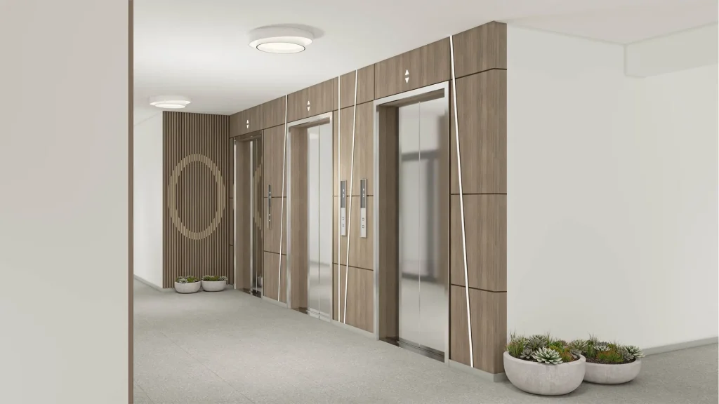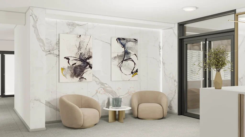 Enterijer zgrade i celog stambenog kompleksa odlikuje se visokim standardima kvaliteta i sofisticiranim dizajnom. Svaki detalj – od hodnika i stepeništa do fasade i terasa – pažljivo je odabran kako bi spojio funkcionalnost, dugotrajnost i estetiku.